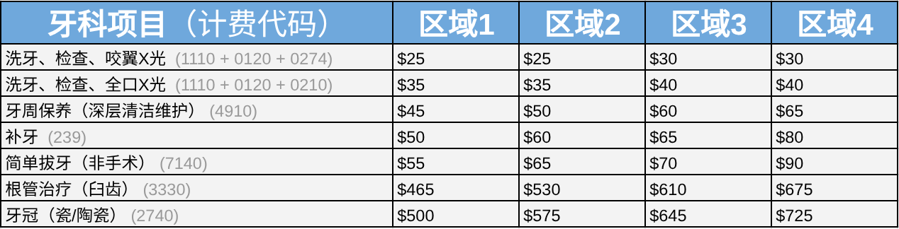 - 基础护理 80% 覆盖:全口 X 光、补牙、封闭剂、实验室检测、非手术拔牙