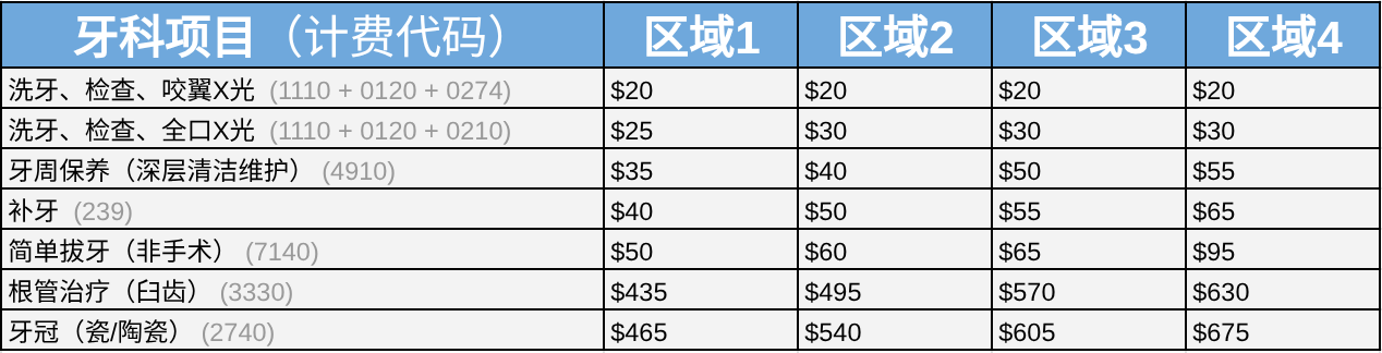 - 重大护理 10–50% 覆盖:根管治疗、外科手术、牙冠、假牙、牙桥、手术拔牙